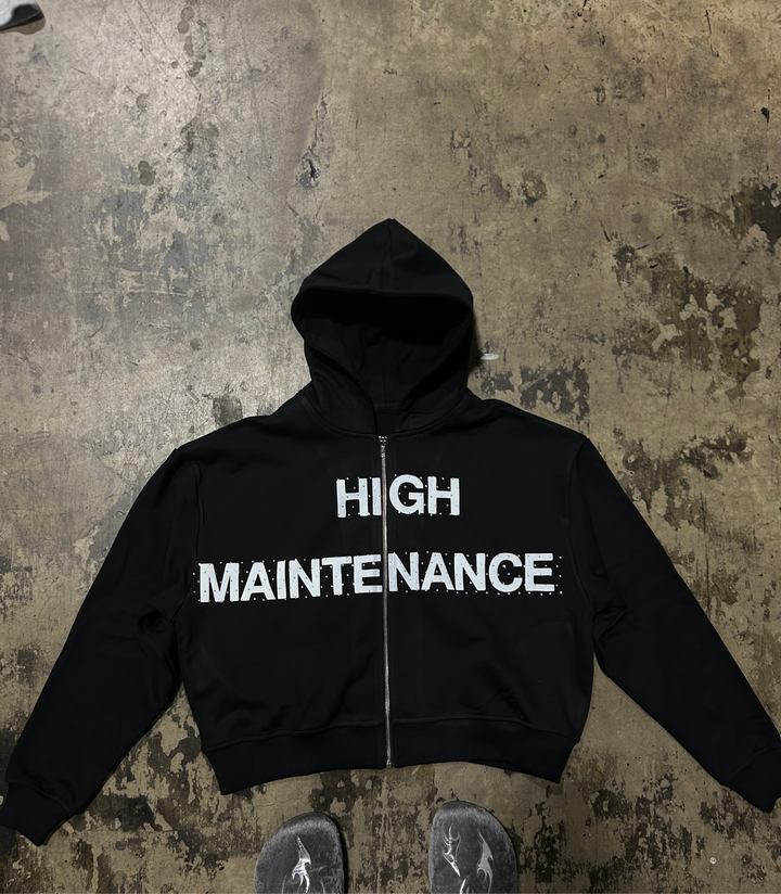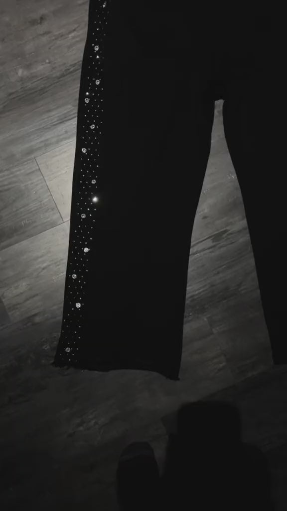 This black rhinestone hoodie boasts a comfortable zip-up design and a cropped fit that stays true to its size. The pants are also rhinestone down the side of the pants with smaller and larger rhinestones with a nice comfy fit